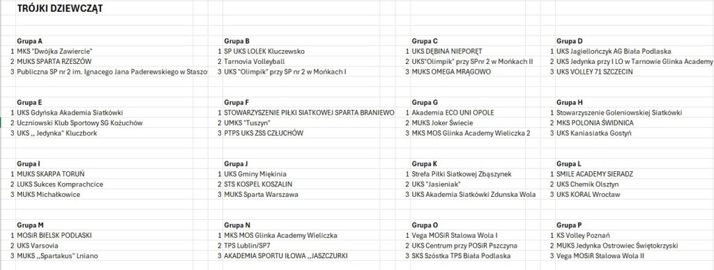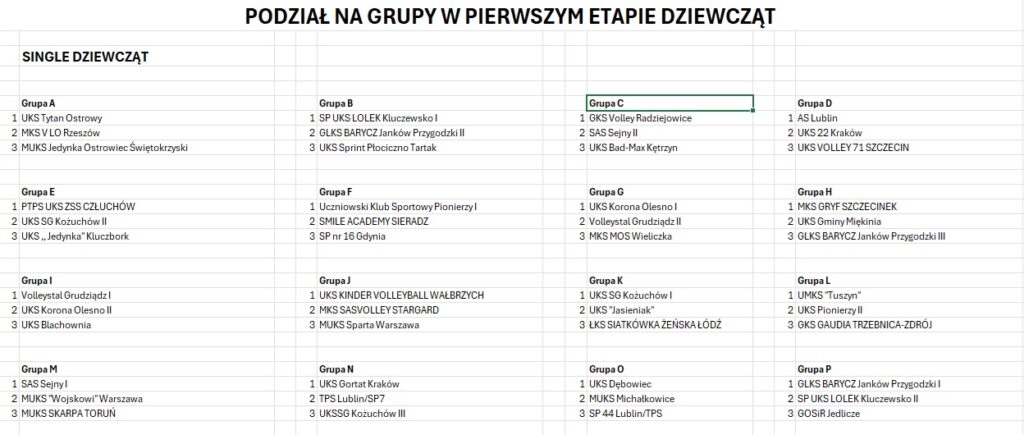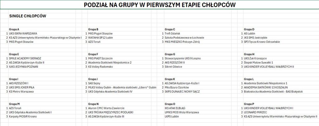 Poniżej przedstawiamy podział na grupy pierwszego etapu 31. Wielkiego Finału KINDER Joy of moving dla każdej kategorii: „singli”, „dwójek”, „trójek”, „czwórek” dziewcząt i chłopców z szesnastu województw.
